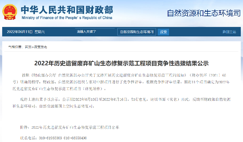 一、2022年歷史遺留廢棄礦山生態(tài)修復(fù)示范工程項(xiàng)目2022年歷史遺留廢棄礦山生態(tài)修復(fù)示范工程項(xiàng)目競(jìng)爭(zhēng)性選拔結(jié)果公示按照《財(cái)政部辦公廳 自然資源部辦公廳關(guān)于支持開(kāi)展歷史遺留廢棄礦山生態(tài)修復(fù)示范工程的通知》(財(cái)辦資環(huán)〔2021〕65號(hào))明確的程序,財(cái)政部、自然資源部組織專(zhuān)家對(duì)申報(bào)項(xiàng)目進(jìn)行了競(jìng)爭(zhēng)性評(píng)審。根據(jù)競(jìng)爭(zhēng)性評(píng)審結(jié)果...