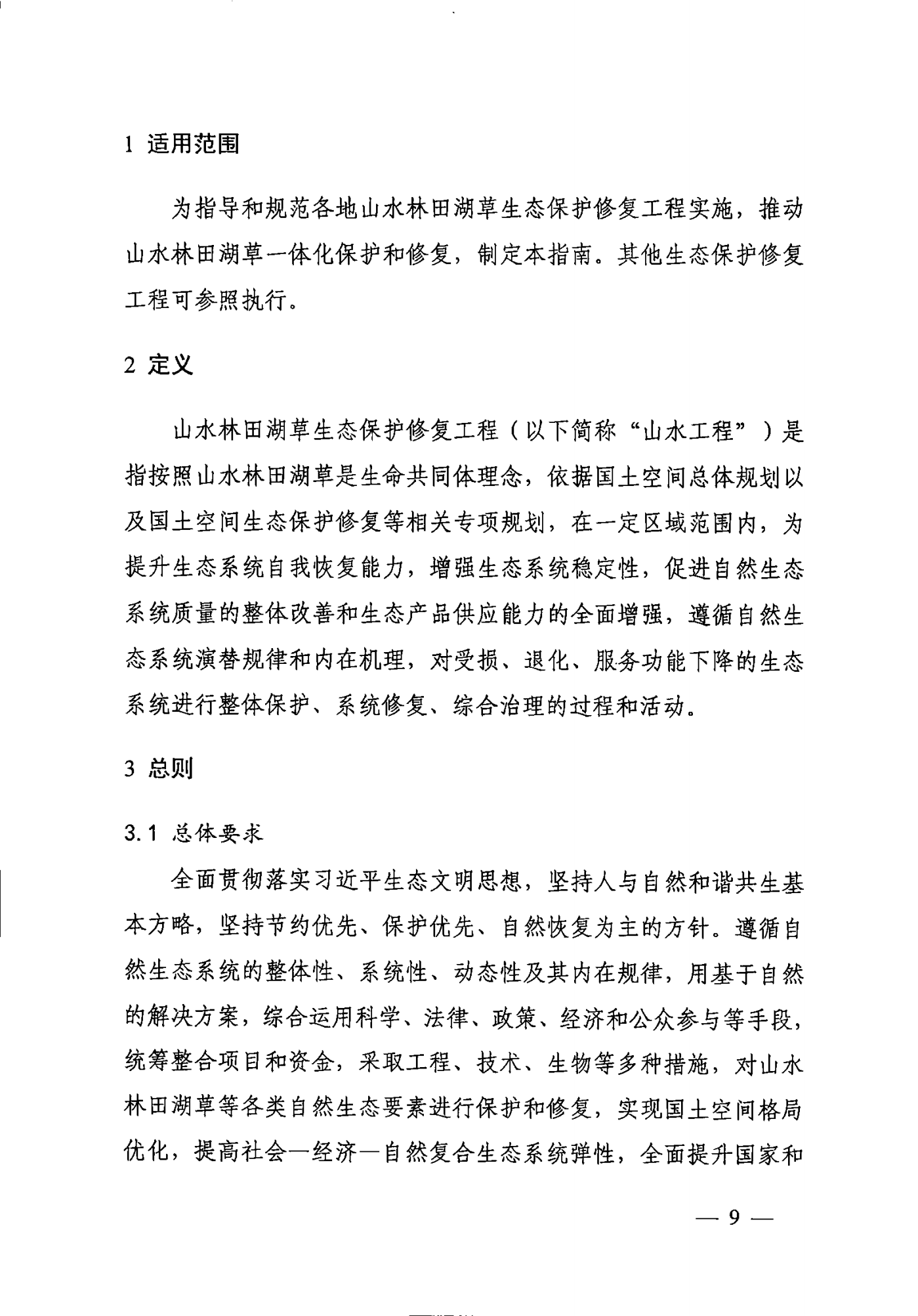 為貫徹落實黨中央、國務(wù)院關(guān)于統(tǒng)籌推進(jìn)山水林田湖草一體化保護(hù)和修復(fù)的部署要求,指導(dǎo)和規(guī)范各地山水林田湖草生態(tài)保護(hù)修復(fù)工程實施,自然資源部、財政部、生態(tài)環(huán)境部研究制定了《山水林田湖草生態(tài)保護(hù)修復(fù)工程指南(試行)》?,F(xiàn)予印發(fā),請結(jié)合實際做好相關(guān)工作,推動山水林田湖草整體保護(hù)、系統(tǒng)修復(fù)、綜合治理。