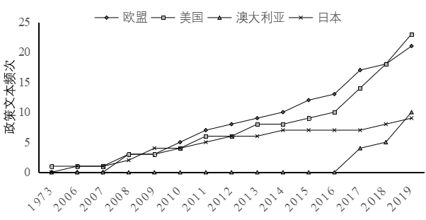 本文對澳大利亞、日本、歐盟和美國2006—2019年出臺的主要關(guān)鍵礦產(chǎn)政策文本進行比較分析??傮w來看,澳大利亞政府的相關(guān)政策出臺較晚,2016年之后加快在關(guān)鍵礦產(chǎn)戰(zhàn)略方面的布局,政策數(shù)量開始上升,2019年確定關(guān)鍵礦產(chǎn)清單,主要政策目標沒有發(fā)生變化。日本、歐盟、美國3個國家(地區(qū))關(guān)鍵礦產(chǎn)戰(zhàn)略呈現(xiàn)政策數(shù)量增加、政策關(guān)注點系統(tǒng)化、清單定期更新與完善3個特征。