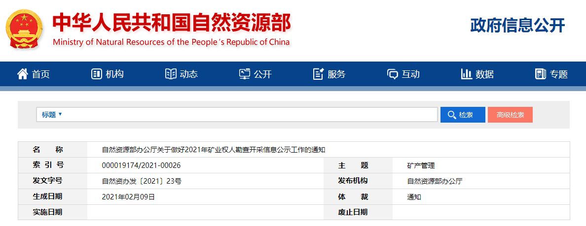 自然資源部辦公廳關(guān)于做好2021年礦業(yè)權(quán)人勘查開采信息公示工作的通知