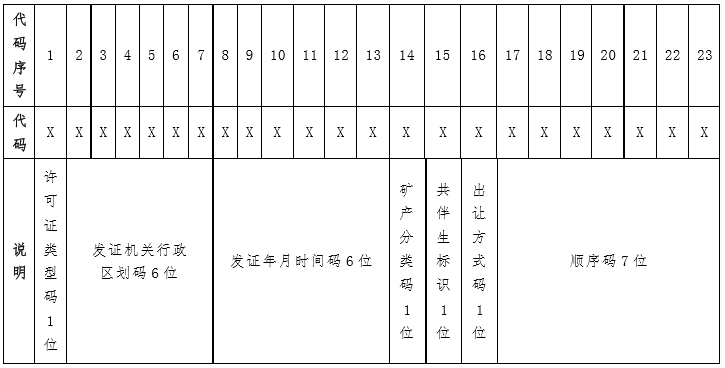 十五、勘查許可證證號和采礦許可證證號編碼由23位字符組成,為永久證號。編碼規(guī)則見附件2。