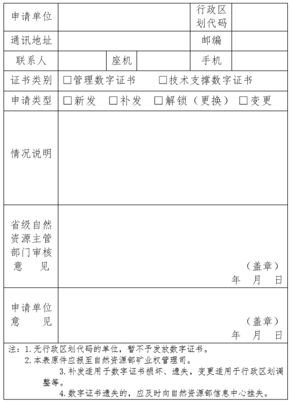 九、數(shù)字證書應(yīng)嚴(yán)格管理,規(guī)范使用。地方各級自然資源主管部門申請新發(fā)、補(bǔ)發(fā)、解鎖(更換)、變更數(shù)字證書的,需通過省級自然資源主管部門向自然資源部提出書面申請。其中,數(shù)字證書遺失的應(yīng)及時向自然資源部掛失。數(shù)字證書申請表見附件1。